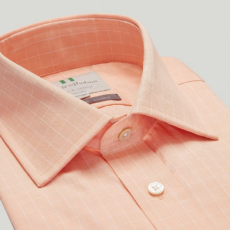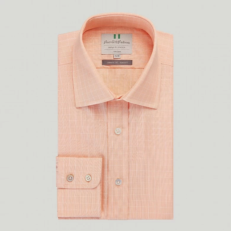 Try a new colour this summer. This Apricot shirt is cut from light end-on-end cotton and has a neat windowpane chalk check. The colour is soft and summery and matches well with our blue, cream or stone coloured summer jackets. 2 button single cuff. Forming a part of our latest collection and perfect for your next occasion. Our new selection of luxury clothing and accessories is limited edition and designed with you in mind. Update your wardrobe with this unique piece completed in the intricate Harvie and Hudson finish.