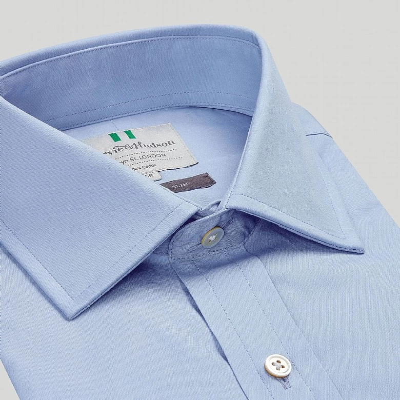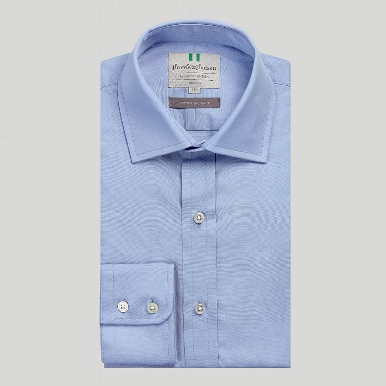 This crisp cotton-poplin azure blue poplin with button cuffs is a great one to wear open-necked with a suit or blazer for a very smart casual look in a slim fit shape. Forming a part of our latest collection and perfect for your next occasion. Our new selection of luxury clothing and accessories is limited edition and designed with you in mind. Update your wardrobe with this unique piece completed in the intricate Harvie and Hudson finish.