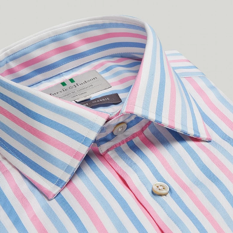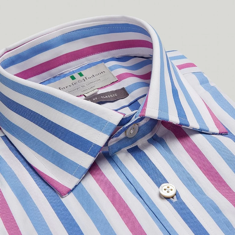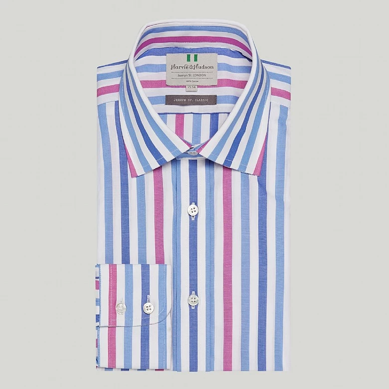 Make a statement this Summer with this striking bold stripe in blue, navy and magenta. Cut from cool, crisp cotton poplin, this shirt will look great open-necked with a blazer. Classic fit with 2 button single cuff. This Blue and Damson Stripe Button Cuff Classic Fit Shirt forms a part of our latest collection and is perfect for your next occasion. Our new selection of luxury clothing and accessories is limited edition and designed with you in mind. Update your wardrobe with this unique piece completed in the intricate Harvie and Hudson finish.