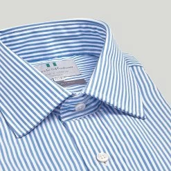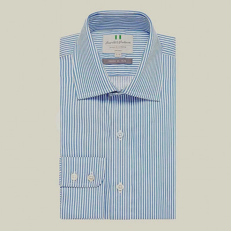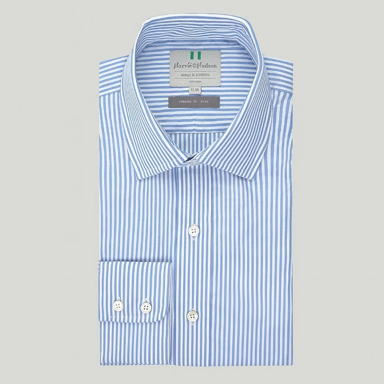 This crisp cotton-poplin blue bengal stripe with button cuffs is a great one to wear open-necked with a suit or blazer for a very smart casual look in a slim fit shape. Forming a part of our latest collection and perfect for your next occasion. Our new selection of luxury clothing and accessories is limited edition and designed with you in mind. Update your wardrobe with this unique piece completed in the intricate Harvie and Hudson finish.