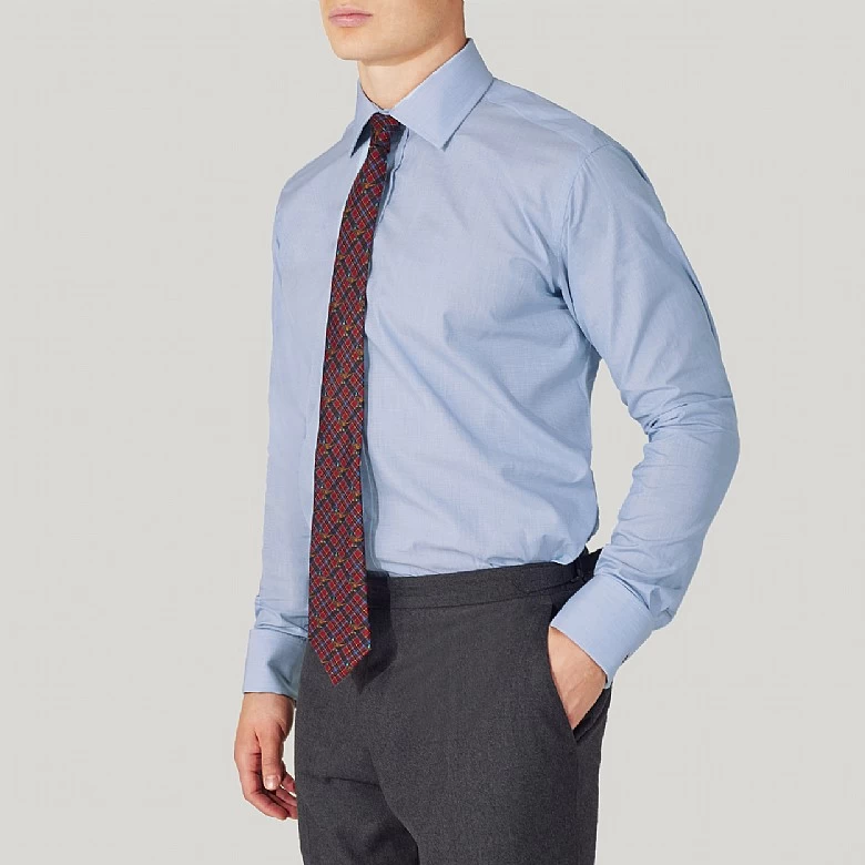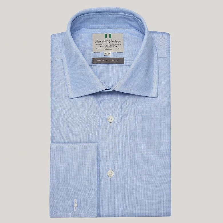 A Jermyn Street classic, our new season blue shirt is made from soft cotton milled exclusively for us. Tailored to a classic fit, it features a semi cutaway Kent collar, double button cuff and mother of pearl buttons. The end on end shirt can be worn with a business suit and matching tie. All our end on end shirts are produced in limited quantities, and milled exclusively for Harvie and Hudson encompassing the quality and exclusive design behind the Harvie and Hudson brand.