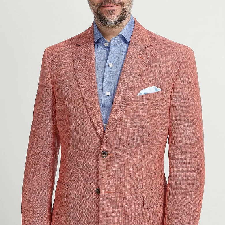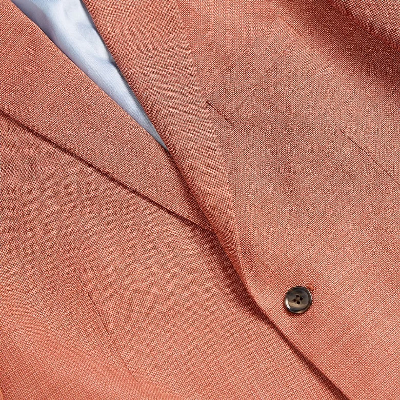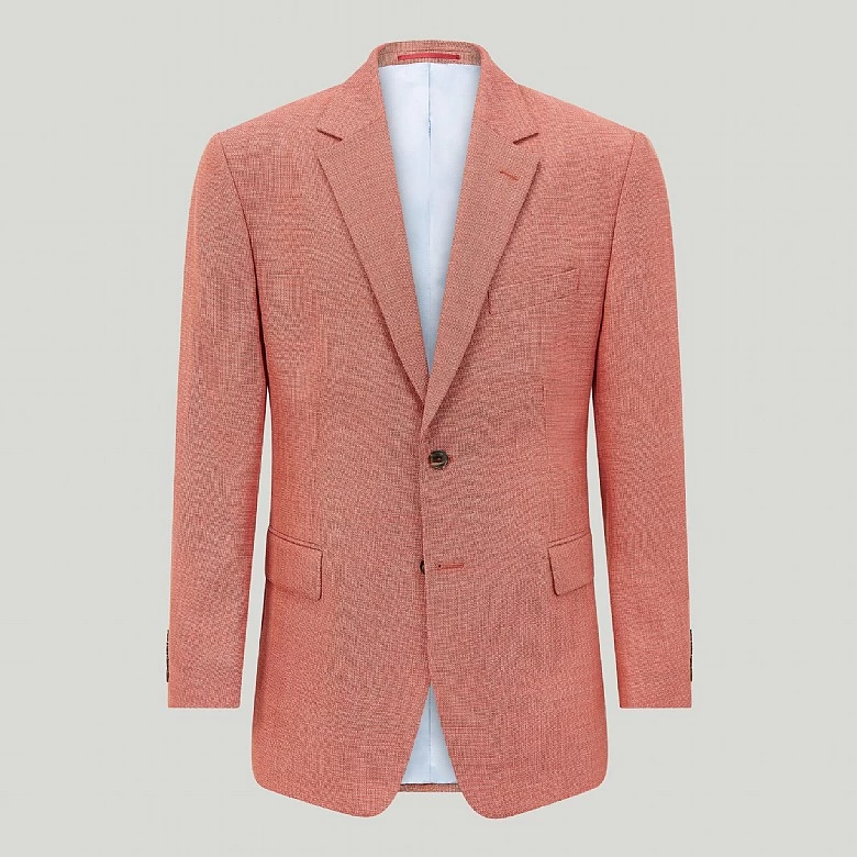 Looking for a summer jacket that will hold its shape and not crease in the hot weather? This pure wool fabric from Barberis in Italy is made with an open weave to keep you cool, but with a high twist so that it does not crease, so it will continue to look perfect all day. This soft orange shade is calm enough to match with tans and browns, but could easily be lifted with a bright orange tie or pocket square. Our new selection of luxury clothing is limited edition and designed with you in mind. Update your wardrobe with this unique piece completed in the intricate Harvie and Hudson finish.