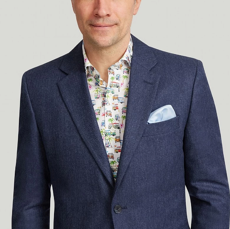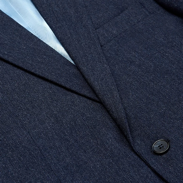 We are pleased to present our Dark Blue Herringbone Wool and Cotton Jacket, the ideal marriage of fashion and comfort. Twin vents on this expertly made jacket increase breathability and mobility, and the piano facing adds a touch of refinement. Working buttonholes on the sleeves provide individualised alterations, precisely balancing the two-button front for a fitted fit. This jacket showcases the finest attention to detail with contrast stitching and an inside lining. Enjoy the timeless beauty of the classic cut, complete with a buttonhole on the left lapel. Improve your wardrobe with this beautiful and functional item.