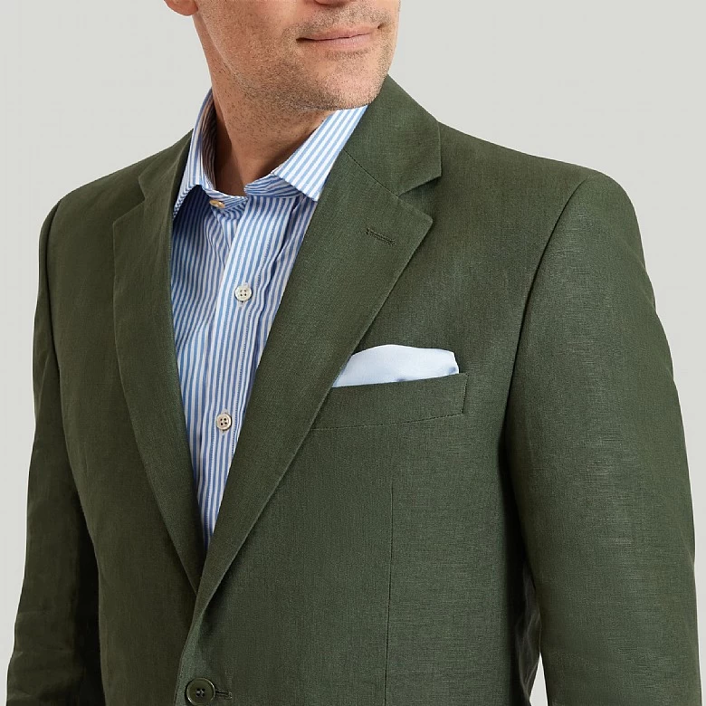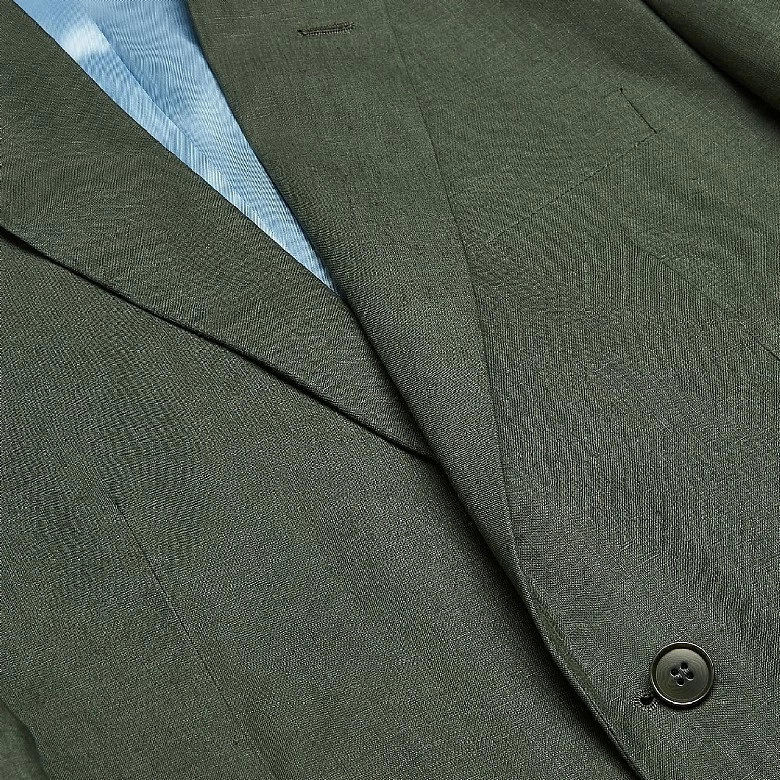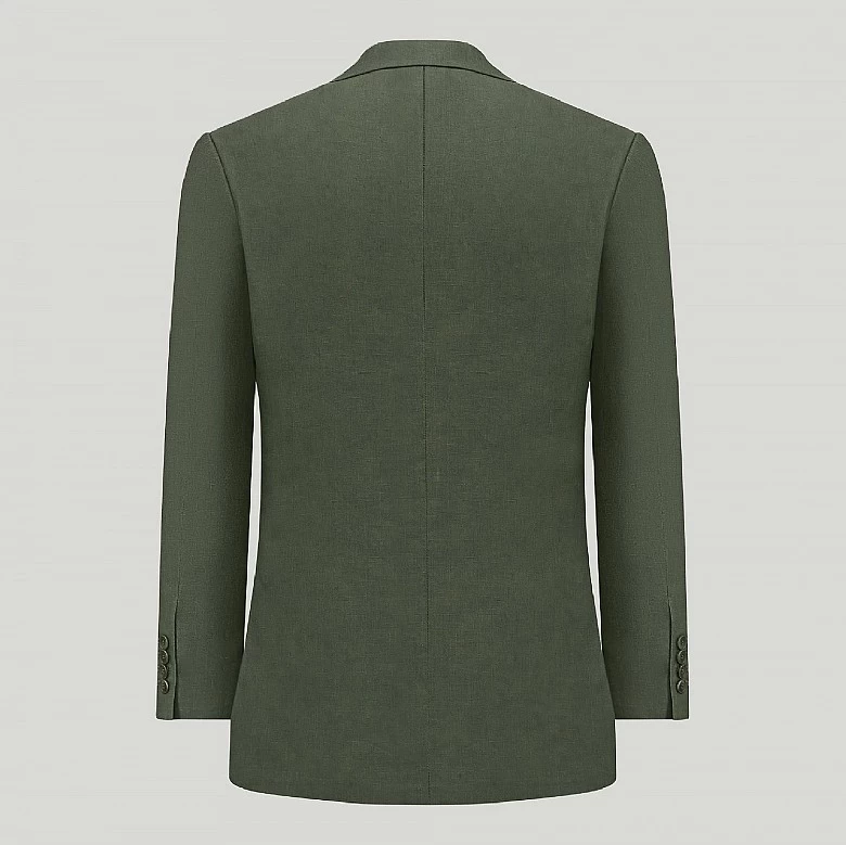 We present our Dark Green Plain Linen Jacket, a chic and functional wardrobe staple. With its piano facing and dual vents, this jacket exhibits superb craftsmanship. A touch of refinement is added by the working sleeve buttonholes, and sophistication is conveyed by the 2-button front. A beautiful contrast is created by the stitching and inner lining contrast. It is embellished with a buttonhole on the left lapel and mixes fashion with utility. This jacket is comfortable and breathable thanks to its high-quality linen construction. The Dark Green Plain Linen Jacket is a timeless piece that simply boosts your wardrobe for any occasion thanks to its classic cut.