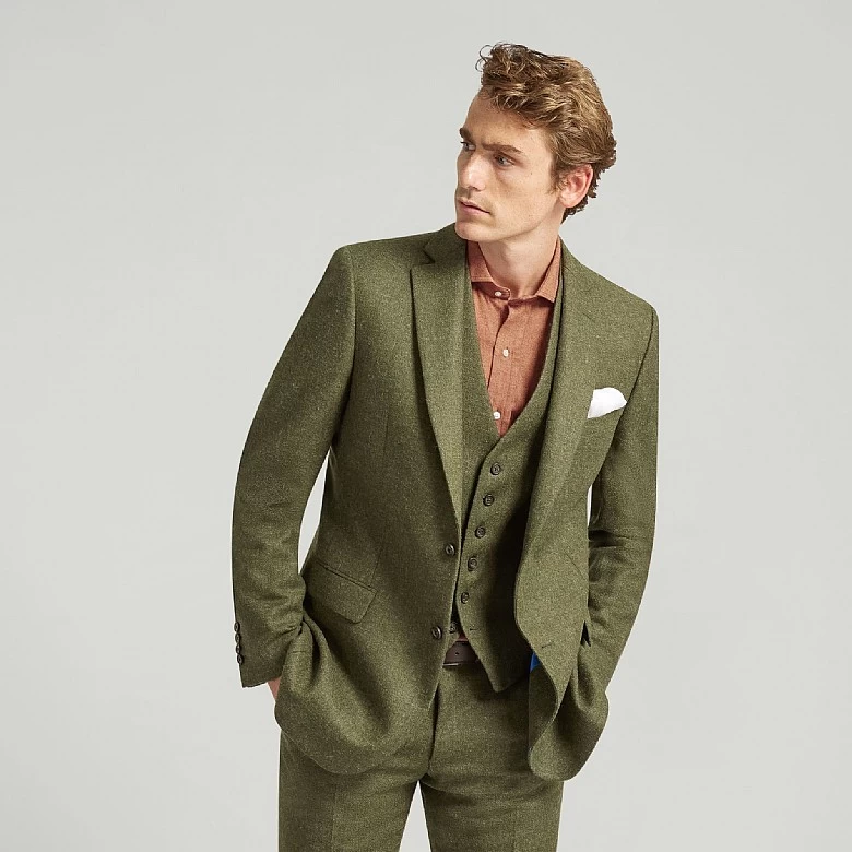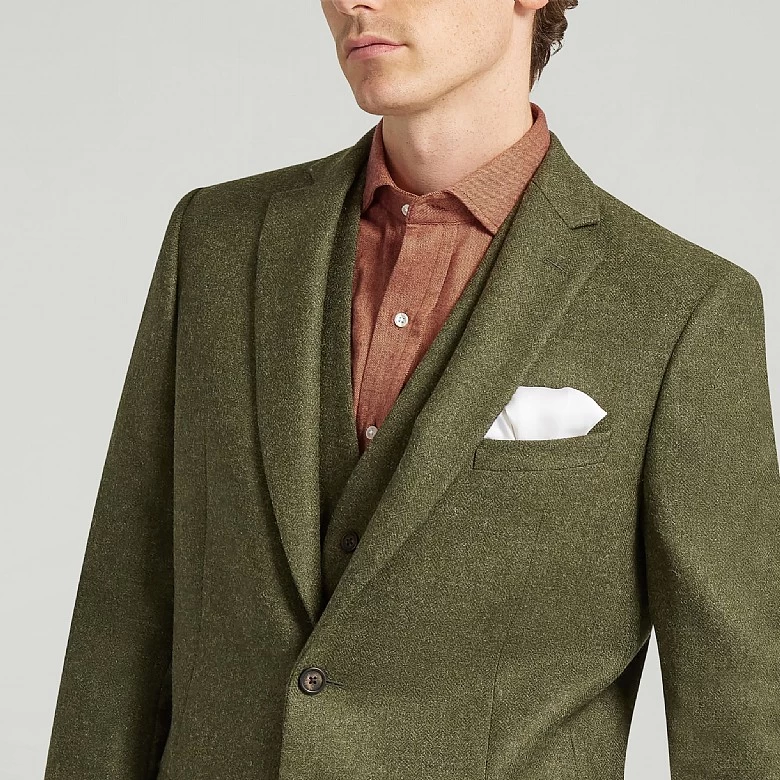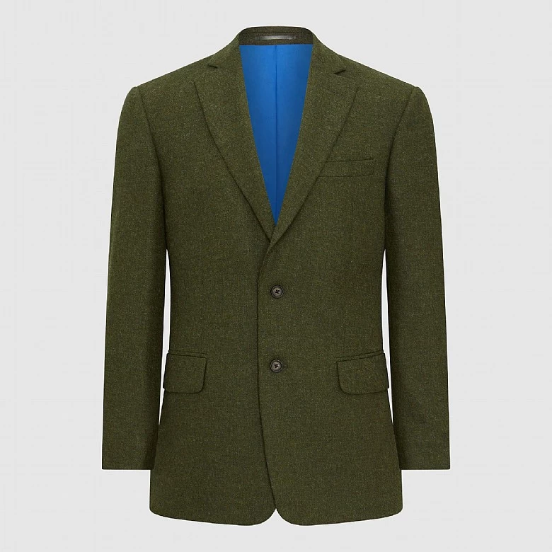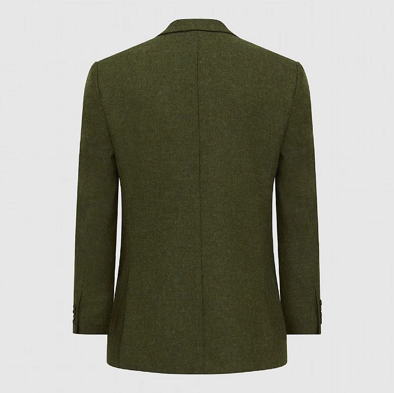Its classic cut offers a tailored silhouette, complemented by the textured depth of the dark green tweed. The sleek piano facing on the lapels adds sophistication, while twin vents ensure a streamlined fit and ease of movement.