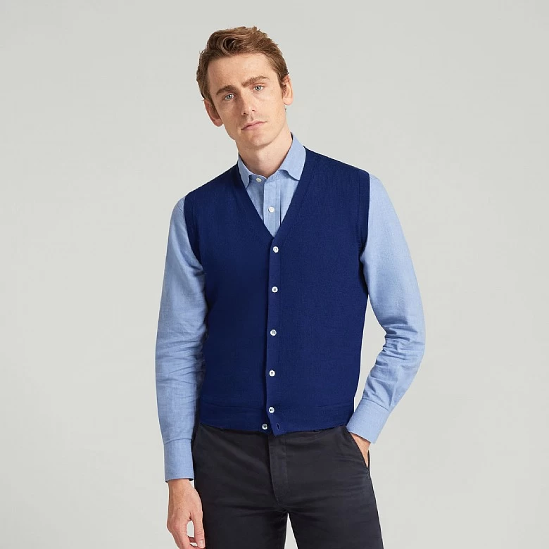 Discover unparalleled sophistication with our French Navy Lambswool Waistcoat. This piece, distinguished by its classic shape, seamlessly complements the wardrobe of the discerning professional. Painstakingly fully fashioned to ensure a precise, tailored fit, every aspect of this waistcoat reflects our dedication to superior craftsmanship. Each detail, from stitch to seam, is thoughtfully finished by hand, highlighting the artisanal quality.