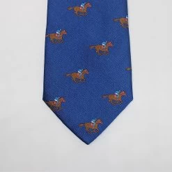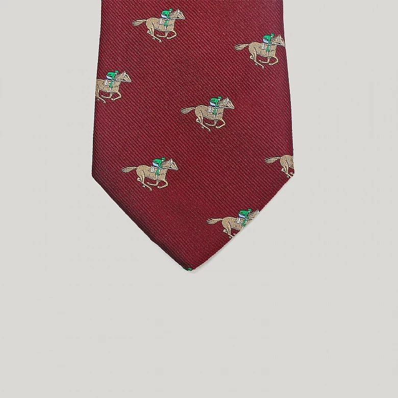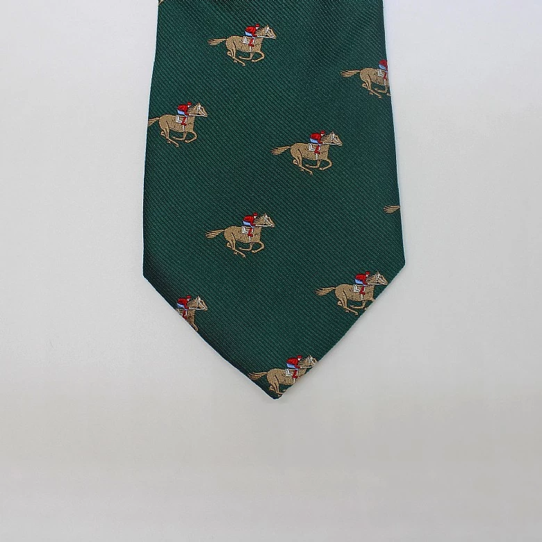 Make a sophisticated statement with the Green Racing Horses Woven Silk Tie. Woven from 100% Italian Silk, this tie showcases spirited racing horses galloping against a lush green backdrop, capturing both elegance and dynamism. The premium wool lining ensures a smooth drape and enduring shape, complementing the intricate design. Whether attending a derby or an upscale event, this tie offers a touch of equestrian charm to any attire. Celebrate the fusion of classic design and exceptional craftsmanship with the Green Racing Horses Woven Silk Tie, a must-have for the distinguished wardrobe.