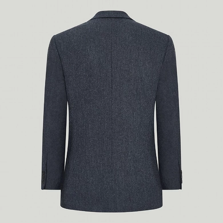 Practicality meets polish with the addition of twin vents, facilitating both ease of movement and a suave drape. The jacket’s elegance is further enhanced by the graceful piano facing on the lapels, a detail that perfectly complements the muted grey and herringbone design.