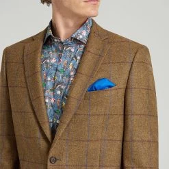 The inclusion of twin vents adds a touch of practicality, ensuring ease of movement while maintaining the jacket’s pristine silhouette. The jacket’s aesthetic charm is magnified by the piano facing on the lapels, drawing attention to the intricate checks and lush green backdrop.