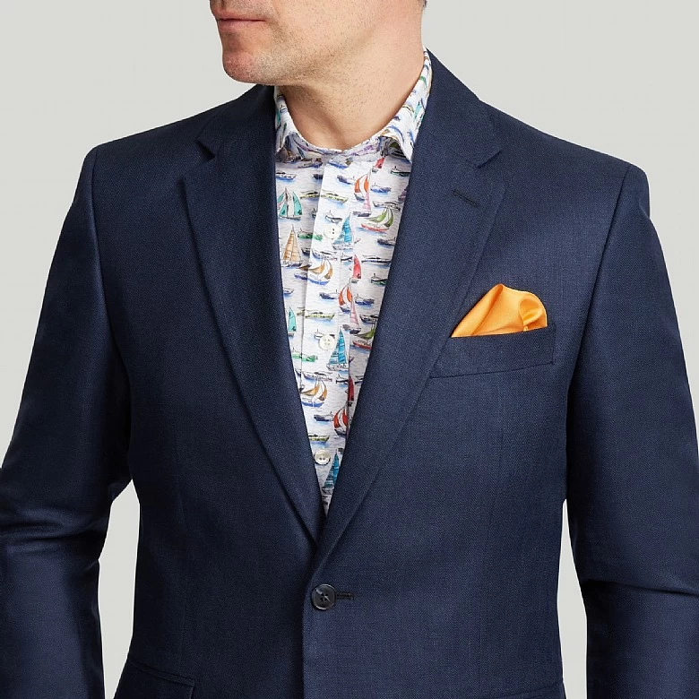 Presenting our Navy Herringbone Linen and Wool Jacket, the ideal fusion of elegance and adaptability. Twin vents on this expertly made jacket increase comfort and mobility, and the piano facing adds a touch of sophistication. Working sleeve buttonholes compliment the two-button front for a custom fit and allow for individual adjustments. This jacket is an outstanding example of attention to detail, with contrasting stitching and an inside lining. Enjoy the timeless beauty of the classic cut, complete with a buttonhole on the left lapel. Improve your sense of style with this beautiful and functional item.
