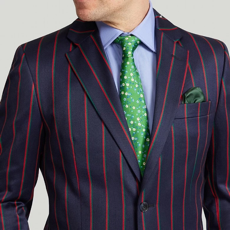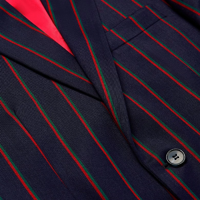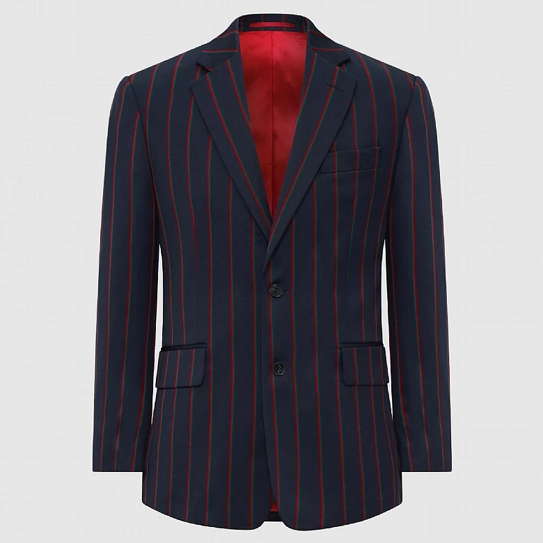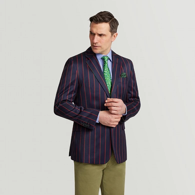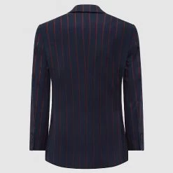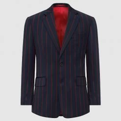 Our Navy Multi Stripe Boating Jacket is a chic and elegant option for the fashion-conscious person. This striking jacket combines many stripes for a distinctive and exciting appearance. With dual vents for increased comfort and movement and a piano front for a touch of delicacy, it is expertly crafted. Working buttonholes on the sleeves provide individualised alterations, precisely balancing the two-button front for a fitted fit. This jacket shows excellent attention to detail with contrast stitching and an inside lining. Accept the traditional cut that exudes timeless elegance, complete with a buttonhole on the left lapel. Improve your sense of style with this bold item.