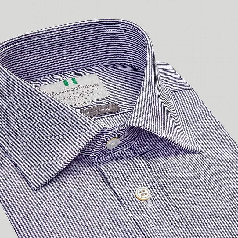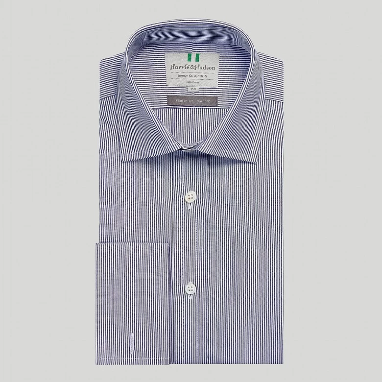 This crisp cotton-poplin navy narrow stripe with double cuffs is a great one to wear open-necked with a suit or blazer for a very smart casual look in a classic fit shape. Forming a part of our latest collection and perfect for your next occasion. Our new selection of luxury clothing and accessories is limited edition and designed with you in mind. Update your wardrobe with this unique piece completed in the intricate Harvie and Hudson finish.
