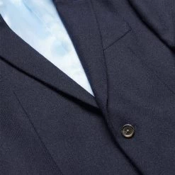 We’re excited to introduce our Navy Pure Wool Jacket, a classic and adaptable staple for your closet. This jacket was carefully constructed with two separate vents to increase wearers’ ease of movement and comfort. The functional sleeve buttonholes and piano facing provide a refined touch of customization. The inner lining and contrasting stitching show off the quality of the construction, while the two buttons in the front ensure a custom fit. This timeless classic has a buttonhole on the left lapel and a classic cut. This top-quality wool jacket expertly combines refined looks with flexible wear.