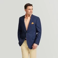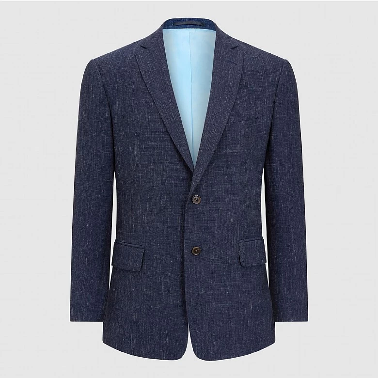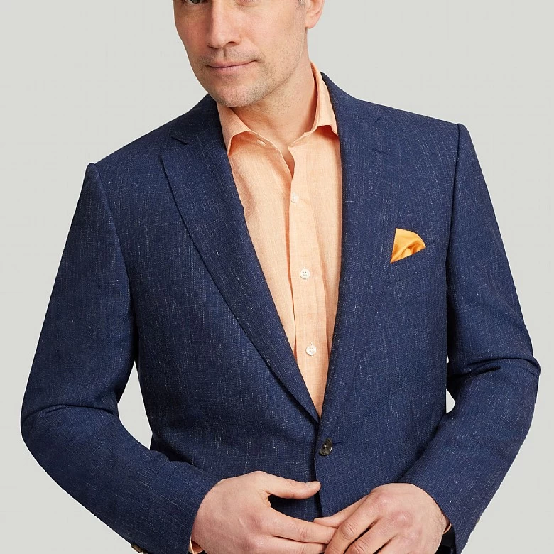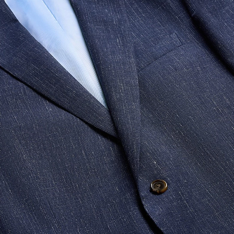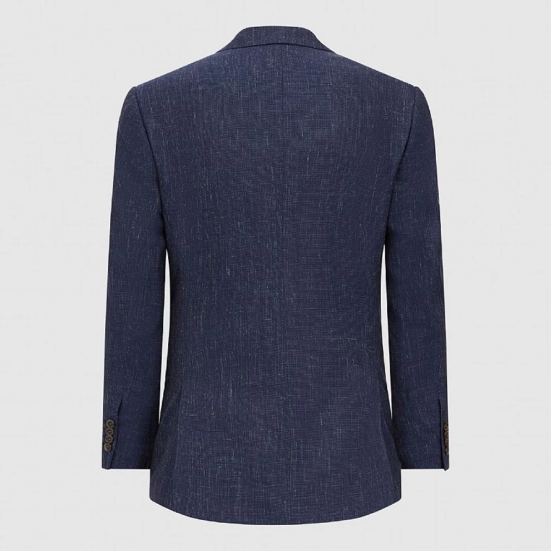 We’re pleased to present our navy semi-plain wool and linen jacket, a classy and functional option for the discriminating guy. With dual vents for maximum comfort and movement and piano facing for a touch of class, this jacket is expertly made. The two-button front and functioning sleeve buttonholes allow for customised alterations and a tailored fit. This jacket has exquisite attention to detail with contrast stitching and an inside lining. Accept the traditional cut that exudes timeless elegance, complete with a buttonhole on the left lapel. With this classy and effortlessly stylish item, up your look.