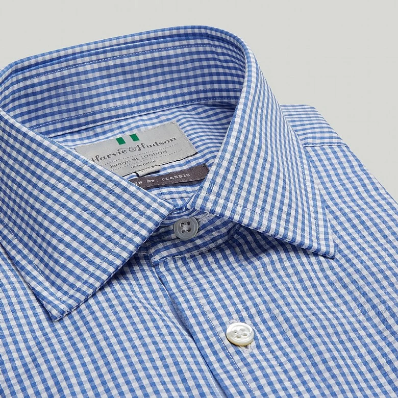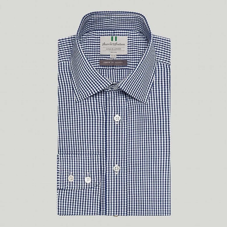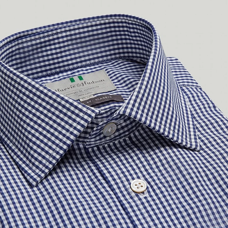 Our classic navy blue gingham shirt returns for Spring 23. A staple of the casual wardrobe, it is cut from cool, crisp cotton poplin and is easy to match with any outfit. Classic fit and 2 button single cuff. This Navy Small Check Button Cuff Classic Fit Shirt forms a part of our latest collection and is perfect for your next occasion. Our new selection of luxury clothing and accessories is limited edition and designed with you in mind. Update your wardrobe with this unique piece completed in the intricate Harvie and Hudson finish.