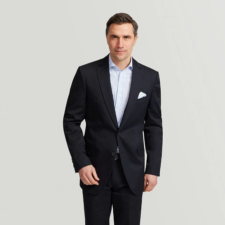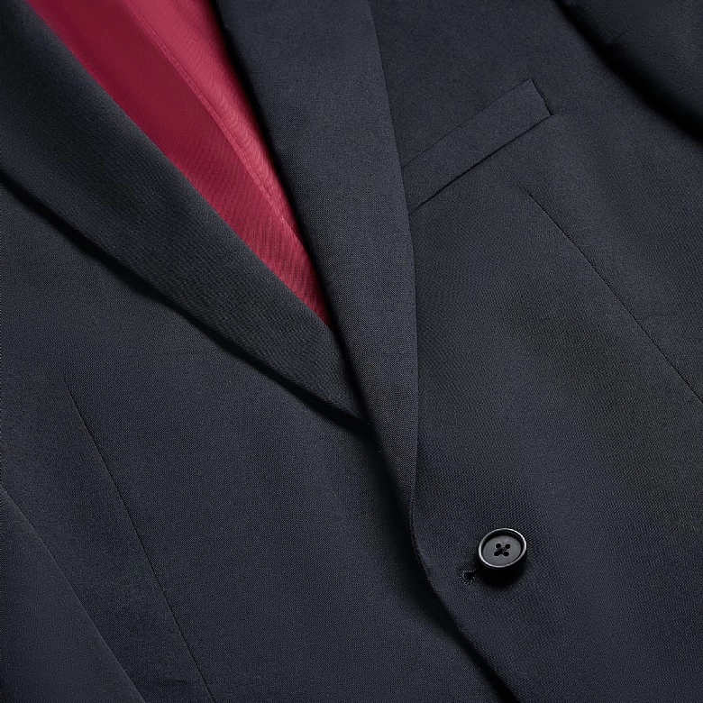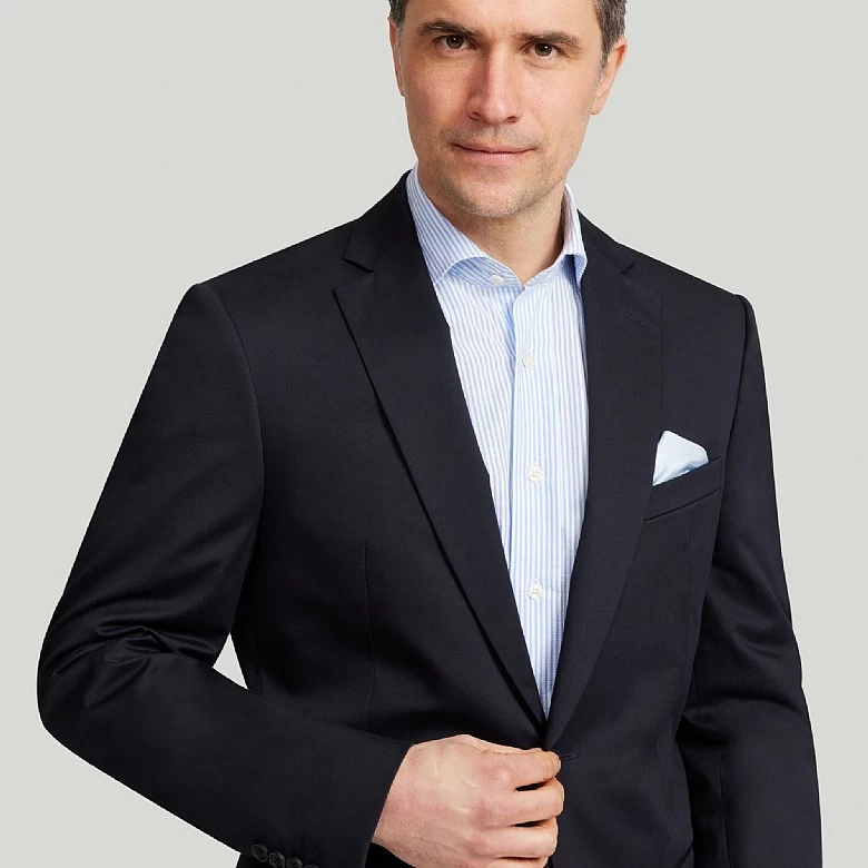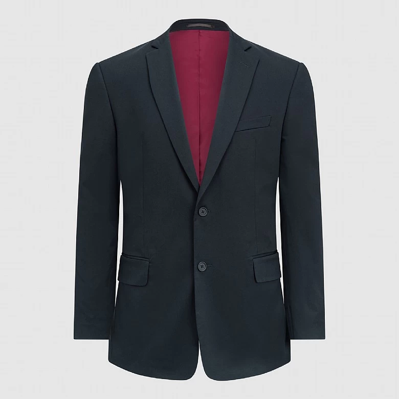 We present to you our navy smart cotton jacket, a stylish and functional addition to your collection. Twin vents on this carefully crafted jacket increase comfort and mobility, while the piano facing adds a touch of elegance. The two-button front and functioning sleeve buttonholes allow for customised alterations and a tailored fit. This jacket showcases great craftsmanship with contrast stitching and an inside lining. Accept the traditional cut that exudes timeless elegance, complete with a buttonhole on the left lapel. With this effortlessly stylish and adaptable piece, up your look.