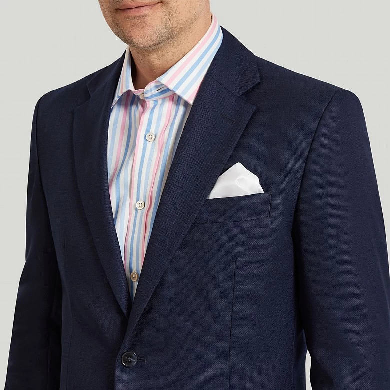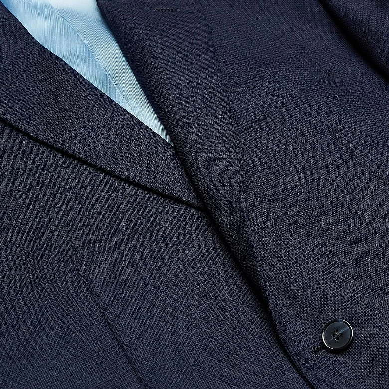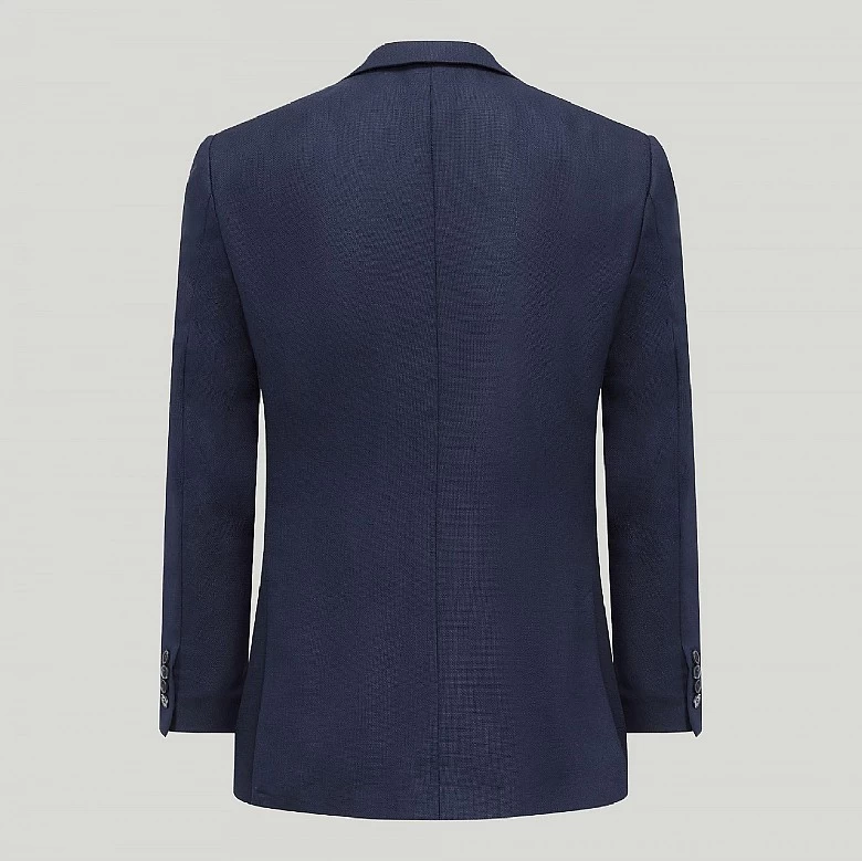 Introducing our navy textured wool jacket, a classic design that oozes class and sophistication. This jacket, which was painstakingly made with attention to detail, has twin vents for better comfort and movement, and the piano facing gives it a classy feel. The two-button front ensures a customised fit, and the functional buttonholes on the sleeves allow for customization. The inner lining and contrast stitching on this jacket show off its superb craftsmanship. The left lapel buttonhole completes the appearance by adding a subdued yet distinguishing accent. Accept a timeless cut that combines style and adaptability with ease.
