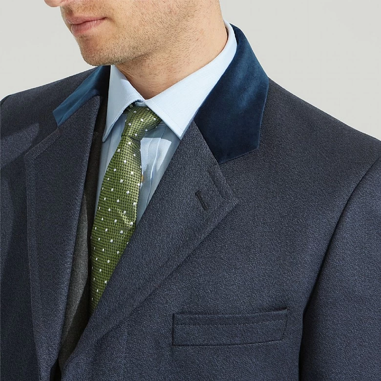Our men’s stylish Covert Coat is made from 100% pure Wool, which features notch lapels and a contrast velvet collar. It is designed with three buttons, one vent and three straight pockets with flaps. This contemporary Navy Covert Coat is ideal for layering over a suit in the Autumn Winter Season. The Wool Covert Coat feels comfortable when worn and equally stylish for in the town and the country. It will keep you warm throughout the Winter period. Wear it with our Grey Birdseye Merino Wool Suit. You will be looking dapper!