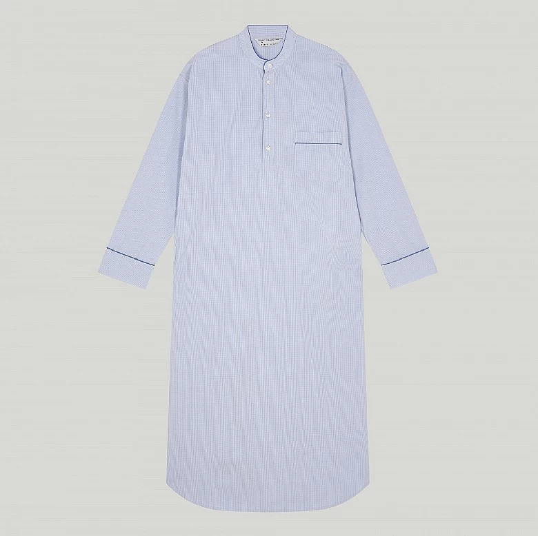 Our luxury mens nightshirts are made from 100% pure cotton. This cotton nightshirt features grandad collar, button placket, rounded shirt-tail hem and breast pocket. Generously cut long for a relaxed and comfortable fit. Complement our Sky Gingham Nightshirt with a dressing gown to keep cosy.